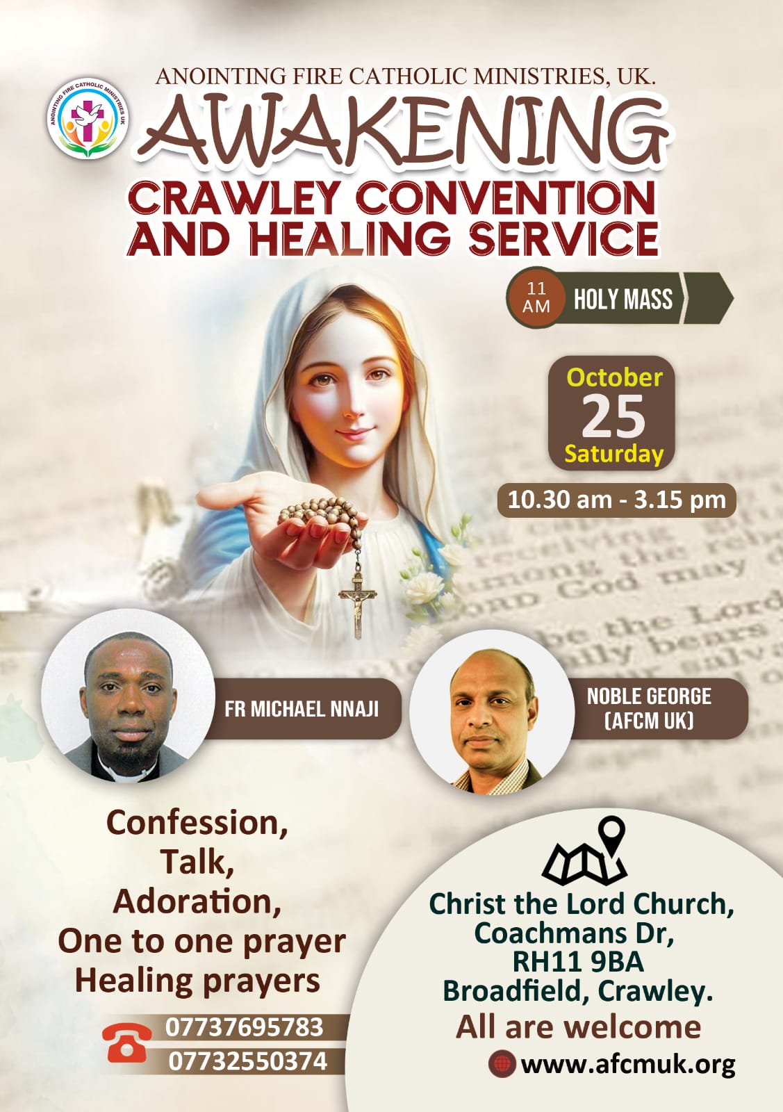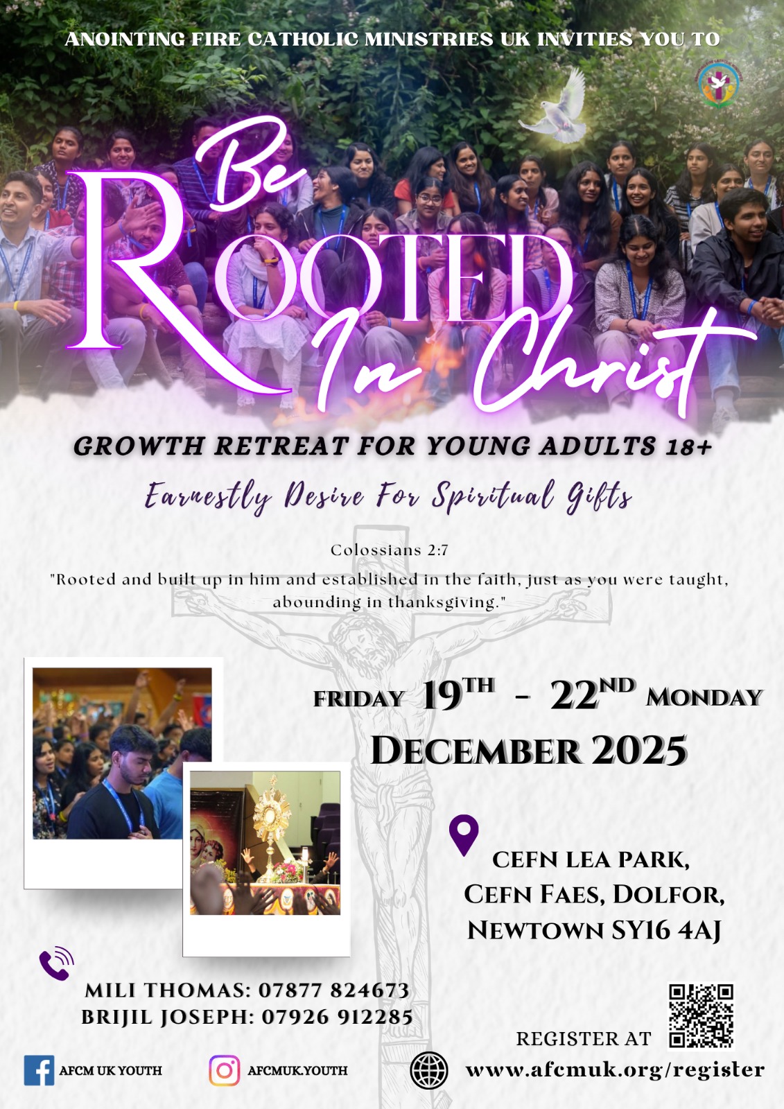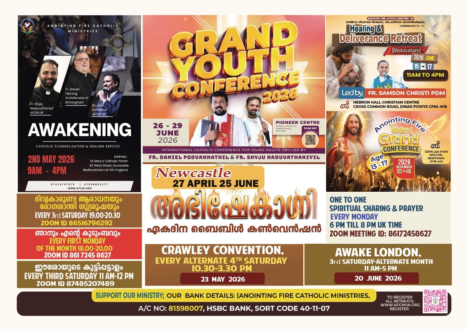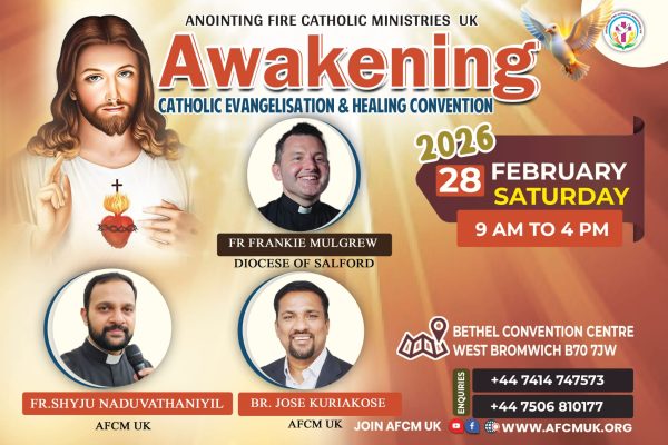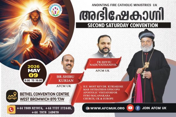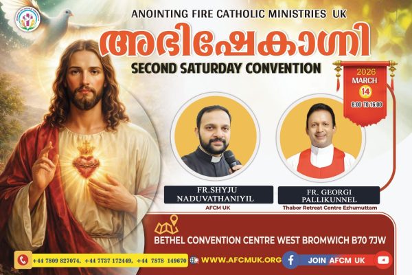 We conduct retreats and conferences for priests, religious and the lay people. All the teachings are based on the Catholic Teaching and the Holy Bible. It also conducts parish retreats and conferences, formation programmes, seminars, youth ministries, media ministries etc for the Catholic children, youth and adults in English and Malayalam languages. Anointing Fire Catholic Ministries is Registered Charity in England and Wales.