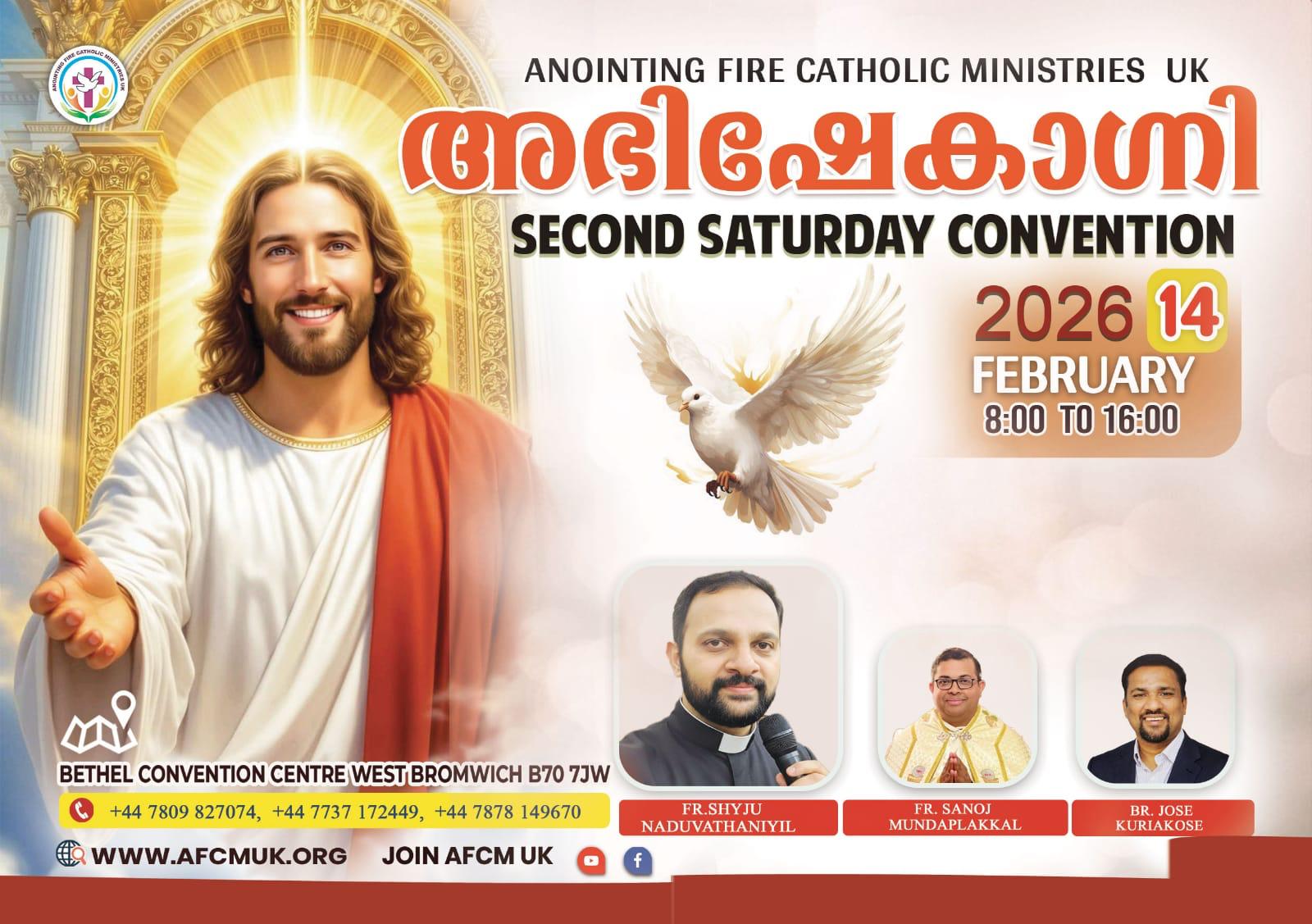 - Second Saturday Catholic Conventions are a celebration of the Faith in Jesus for people of all ages and backgrounds. These family friendly gatherings include lively praise and worships, Holy Mass, Healing Services, Inspiring Bible Talks, and Eucharistic Adoration. Confessions and Spiritual Sharing are possible in English, Hindi, Malayalam, Tamil languages. As it’s a day of fasting, if you prefer to have food, kindly have a packed lunch with you. Food stalls are not available on the venue. Separate streams for children from age 5-16. No booking is required. Free car parking is available on site.
